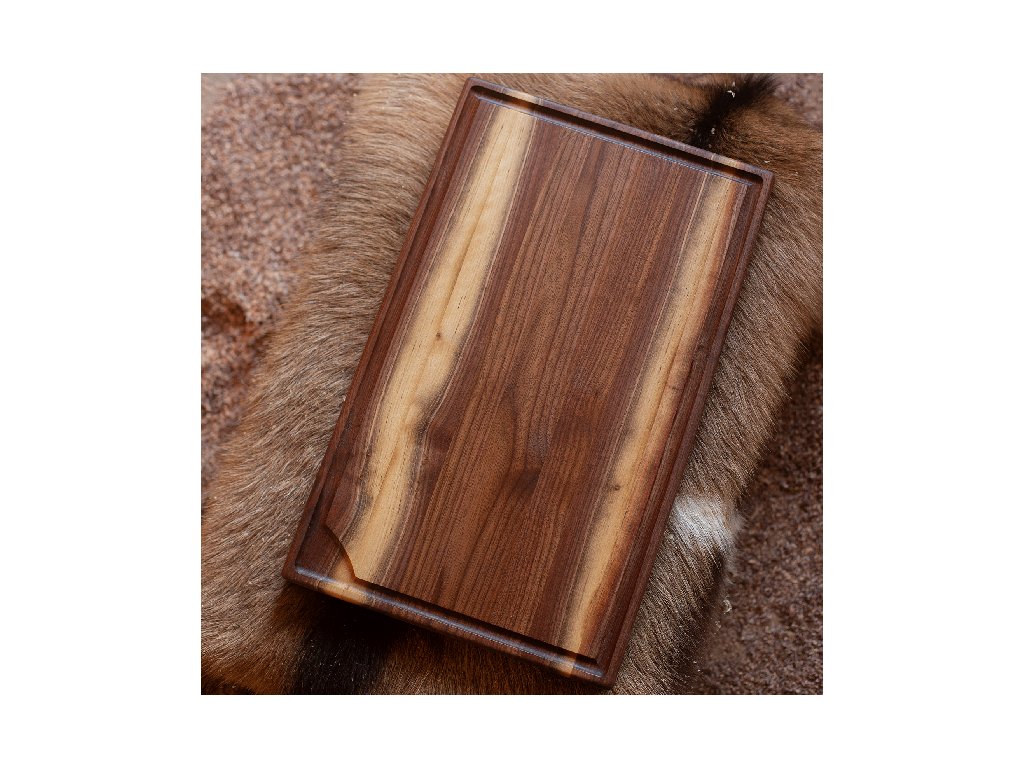 Masivní ořechové dřevo. Drážka pro odtékání šťáv a výřez pro podsunutí talíře.